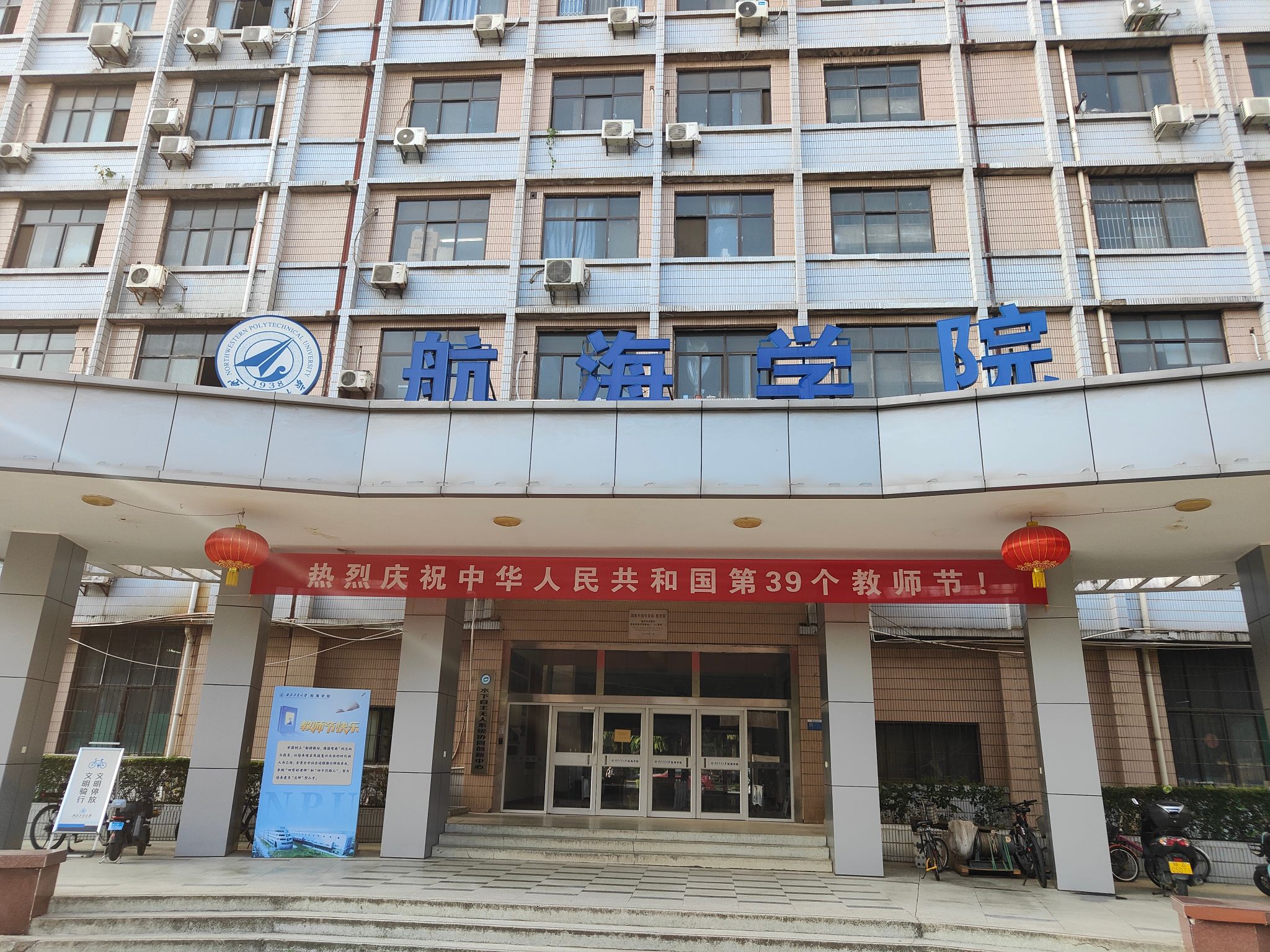 办公楼前悬挂“热烈庆祝中华人民共和国第三十九个教师节”横幅,并摆放“师恩难忘”等标语师生合影背景墙。